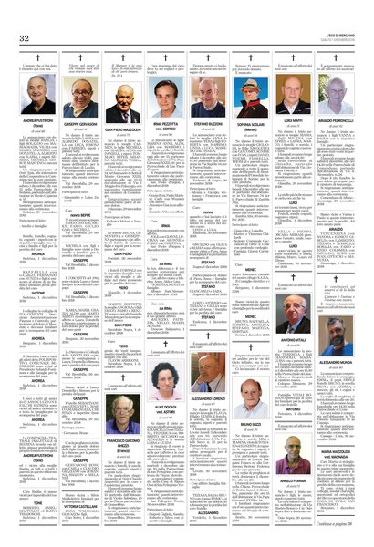 I funerali si svolgeranno sabato 1 dicembre alle ore 15 nella Parrocchiale di Sedrina, partendo dall'abitazione in Vicolo Capisoni n. 15.