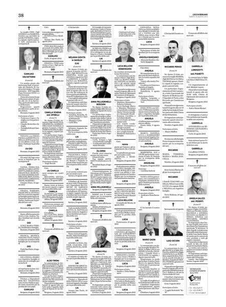 I funerali avranno luogo nel cimitero di Sarnico lunedì 12 agosto alle ore 10 con rito dei testimoni di Geova partendo dall'abitazione di Via Spartana n. 30.