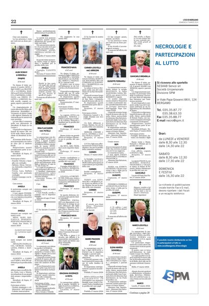 I funerali avranno luogo martedì 19 marzo alle ore 10.30 nella chiesa di Ognissanti del cimitero di Bergamo.